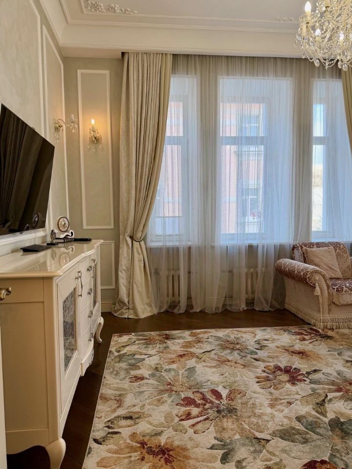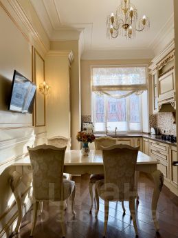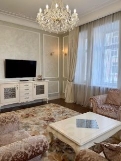 Общая площадь квартиры 120 квм. Планировка: 4 жилые комнаты (28, 23, 21 и 16 квм), кухня 15 квм, 2 санузла - с душевой кабиной и гостевой, гардеробная с системой хранения. В квартире высокие потолки (3,4 м.), большие светлые окна. Состояние квартиры после ремонта. Паркет натуральный дуб. Стены - декоративная штукатурка. Потолок лепнина. Квартира оснащена всей необходимой мебелью и бытовой техникой. Мебель натуральный массив, производство Италия.