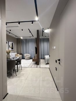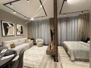 - Гостиная зона: раскладным диваном, тв мультимедиа, парящая тумба с подсветкой под ТВ и крутящий кресло.