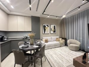 - Кухонная зона: кухонный гарнитур с подсветкой, холодильник двух камерный, духовой шкаф с функцией микроволновой печь, электрическая плита, посудомоечная машинка, посуда на 4 персон, обеденный стол и с 4 стульями;