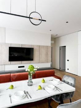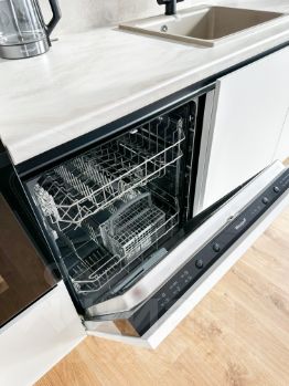 Бытовая техника: стиральная машина с функцией сушки, холодильник, духовой шкаф, варочная панель, вытяжка, микроволновая печь, посудомоечная машина, кондиционер,чайник , а так же все необходимое для комфортного проживания.