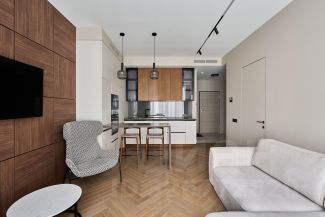 Квартира 55 метра, гостиная-кухня и спальня. Дизайн выполнен в современном стиле, без перегруза, но с характером. Каждая деталь продумана: приточная вентиляция создаёт идеальный микроклимат, гардеробная и встроенные шкафы дарят ощущение лёгкости и порядка. Всё лишнее спрятано, осталось только красивое.