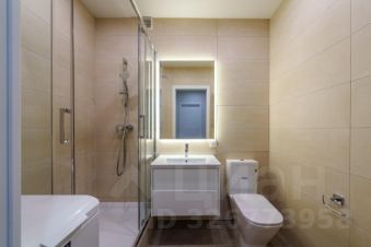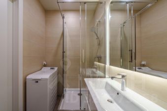 - двуспальная кровать с прикроватными тумбами и шкафом; В квартире один совмещенный санузел с душевой кабиной, стиральной машиной, раковиной с зеркальной подсветкой.