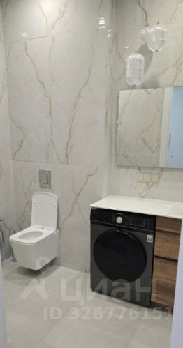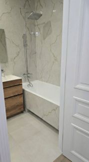 Санузел: Совмещенный, отделка крупноформатным керамогранитом "под мрамор", новая качественная сантехника, ванна.