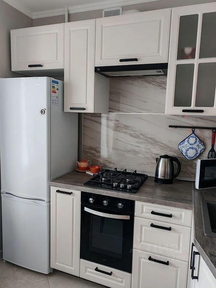 Кухня: новый гарнитур с подсветкой рабочей зоны, холодильник, микроволновая печь, электрический чайник, газовая варочная панель, электрическая духовка, вытяжка, обеденный стол с двумя стульями.
