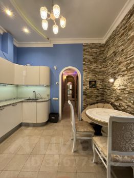 Общая площадь — 75.3 кв. м, жилая площадь — 35.2 кв. м, площадь кухни — 11.2 кв. м. Квартира расположена на 3-м этаже 6-этажного кирпичного дома 1914 года постройки. Высокие потолки — 3.5 метра. Соседей не слышно.