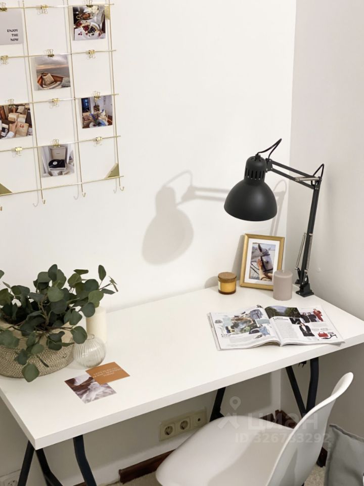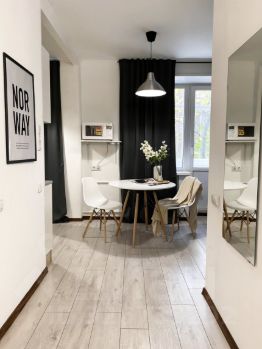 Интерьер продуман таким образом, чтобы вам было удобно жить, отдыхать и работать. В комнате стоит удобный диван, который превращается в полноценное спальное место, а система хранения представлена комодом и полками. Большое зеркало в полный рост создаёт ощущение простора, а рабочий стол со стулом и лампой позволяет организовать комфортную рабочую зону. В студии есть уютный балкон — идеальное место для утреннего кофе или вечернего отдыха. Санузел аккуратный и совмещённый.