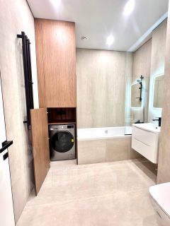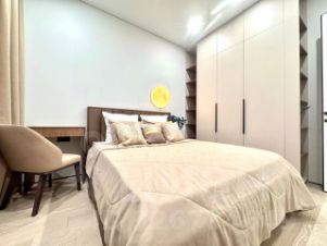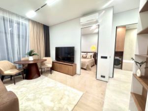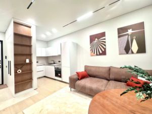 Просторная планировка включает изолированную спальню и кухню-гостиную. Квартира полностью укомплектована современной бытовой техникой: холодильник, посудомоечная и стиральная машины, кондиционер, телевизор. Ванная комната оборудована всем необходимым.