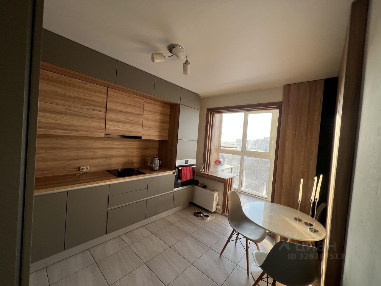 Самая классная часть мы утеплили балкон и объединили его с кухней. Там получилось полноценное рабочее место со столом и небольшим диванчиком. Можно работать в тишине или пить кофе с видом на район. Есть микроволновка, индукционная печь, холодильник и посудомоечная машина.
