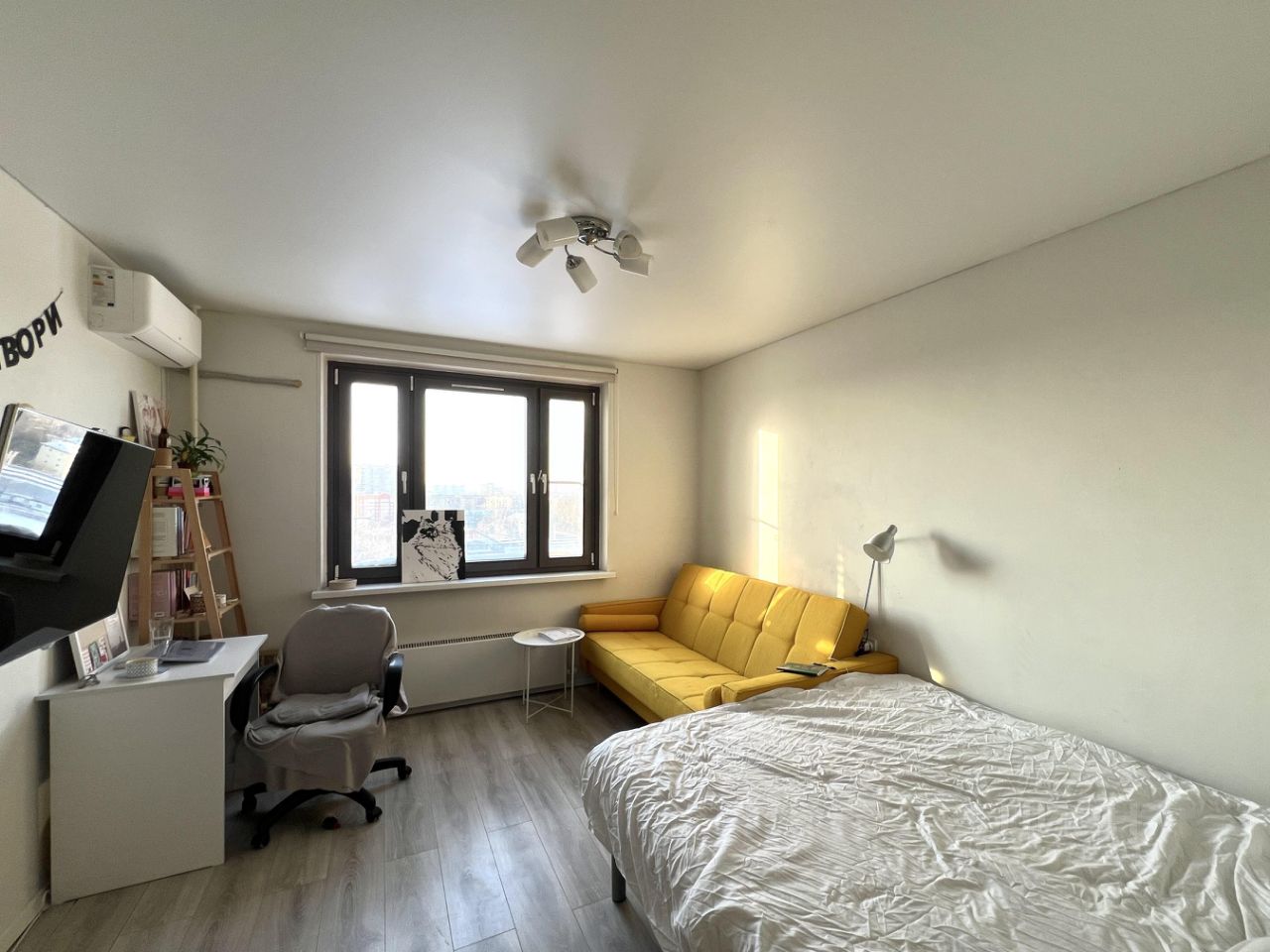 В комнате стоит и кровать, и диван, есть рабочее место, телевизор, кондиционер (летом спасает).
