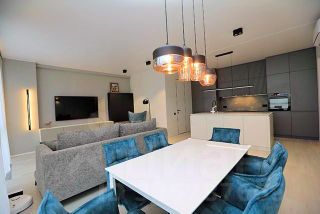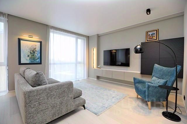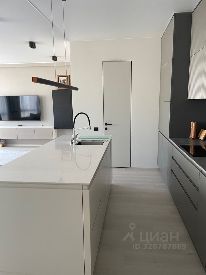 В гостиной: кухонный гарнитур с островом. В наличии вся бытовая техника: холодильник, посудомоечная машина, электроплита и духовой шкаф. Обеденная зона, большой диван, телевизор.