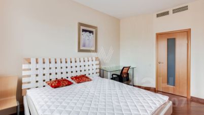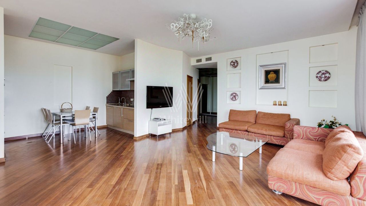 Планировка: кухня-гостиная с обеденной зоной на 5 человек, 2 спальни, кабинет, в котором можно организовать дополнительную спальню, 2 санузла — один с ванной, второй — с дешевой кабиной, холл. Квартира оснащена всей необходимой мебелью и техникой. Предусмотрено много мест для хранения. Для автовладельцев предусмотрено машиноместо во дворе дома.