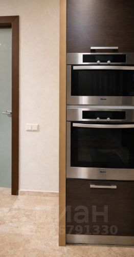 Кухня полностью укомплектована техникой премиального уровня Miele: духовой шкаф, паровой шкаф, посудомоечная машина, холодильник — всё интегрировано в единый архитектурный ансамбль.