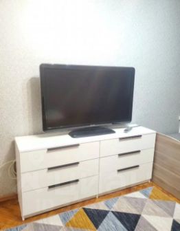 В большой комнате, вместительный шкаф, диван, кровать, большой телевизор, тумбочка, комод новый. Комната очень просторная.