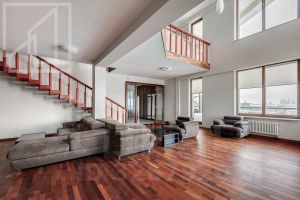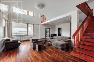 Планировка: гостиная, кухня-столовая, 3 спальни, 2 кабинета, лаунж-зона с бильярдом, 6 санузлов, холл. Установлена приточно-вытяжная система вентиляции и кондиционирования, система подогрева полов. Предусмотрено 4 открытых балкона. Из окон открывается панорамный вид на город.