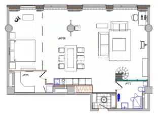 Планировка : кухня - гостиная с рабочим местом, спальня (установленная перегородка между гостиной и спальней), санузел, гардеробная. Есть отдельное спальное место, над лестницей. При входе в квартиру есть выдвижная ниша для верхней одежды.