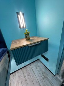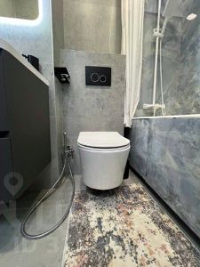 - Комфортная ванная комната с подвесной сантехникой, тропическим душем и витражной вентиляцией.