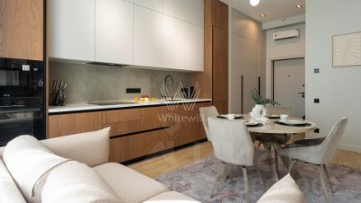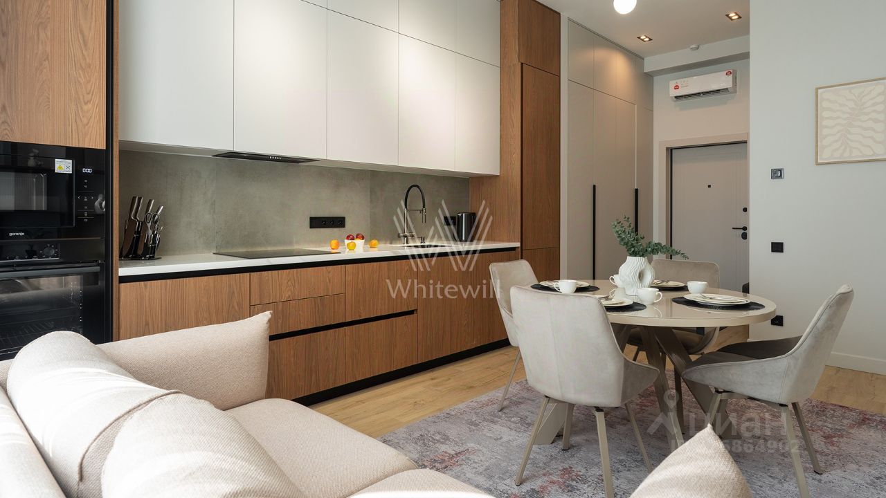 Видовая квартира с двумя спальнями общей площадью 69 м² в комплексе бизнес-класса Now на берегу Москвы-реки. Светлый интерьер оформлен в современном стиле. Планировка: кухня-гостиная с обеденной зоной, основная спальня с тремя окнами, вторая спальня, ванная комната, второй санузел с душевой, прихожая. Из спальни спланирован выход на лоджию с панорамным остеклением. Квартира полностью меблирована и укомплектована бытовой техникой. Установлена система кондиционирования, стиральная и посудомоечная машина. Из окон открывается вид на реку и территорию комплекса. Предусмотрено одно машино-место за дополнительную плату.