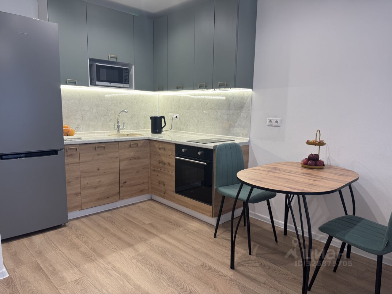 -Кухня встроенная - духовой шкаф, индукционная плита, вытяжка, посудомойка, раковина, микроволновая печь, холодильник , проточный фильтр питьевой воды, набор посуды для еды и питья.
