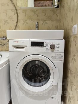 Ванная комната выложена современной плиткой, установлена акриловая ванна, раковина, стиральная машинка с большим барабаном BOSCH.