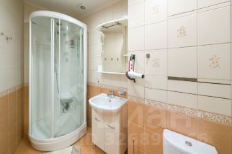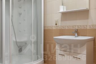 Ванная комната: душевая кабина, стиральная машина, всё чисто и ухоженно.