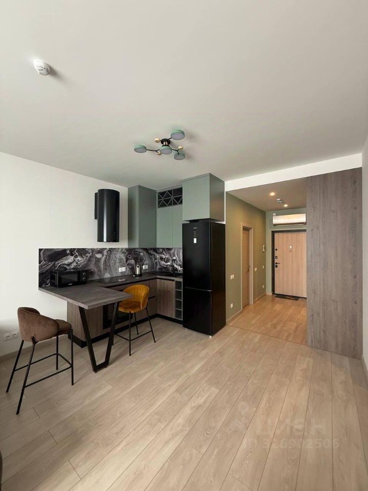 Квартира с качественным ремонтом, светлая и уютная. В студии есть всё необходимое для комфортной жизни: современная мебель на кухне и в комнате, холодильник, стиральная машина. Санузел совмещённый, оборудован ванной. Окна выходят во двор, поэтому в квартире тихо и спокойно.