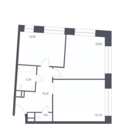 Функциональная планировка: просторная кухня-гостиная, спальня, кабинет (или вторая спальня), санузел с душевой кабиной.