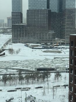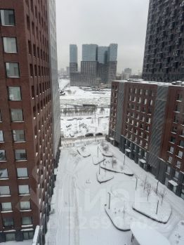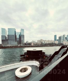Гостиная: Просторная кухня-гостиная (23 кв. м) с тремя панорамными окнами. Прямой вид на Москву-реку и комплекс Москва-Сити.