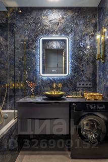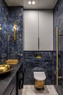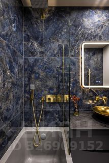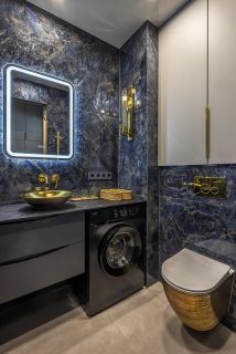 Совмещенный санузел оформлен в элегантной мраморной плитке. Итальянская сантехника, стиральная машина, качественная фурнитура. Спокойная благородная цветовая гамма.
