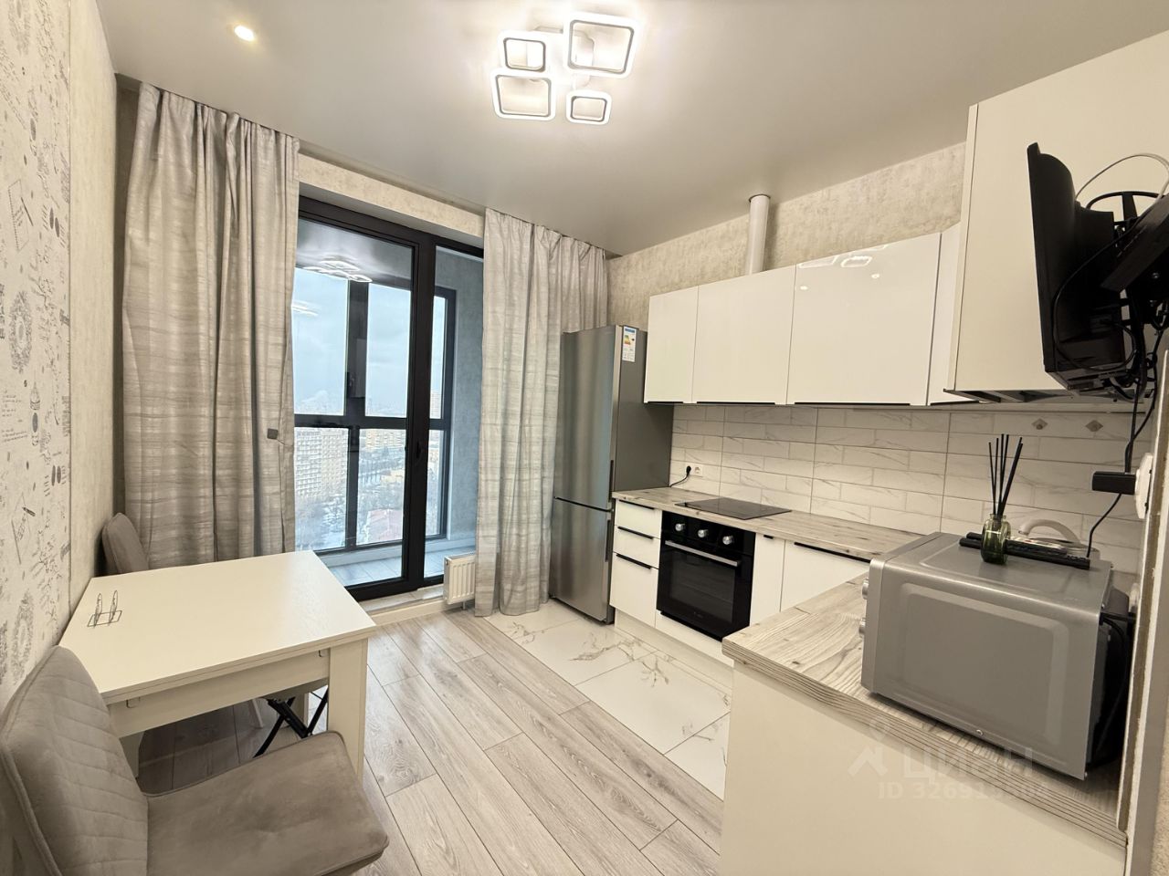 Сдается уютная, чистая, видовая однокомнатная квартира в современном жилом комплексе. Общая площадь квартиры — 40 кв. м, расположена на 21-м этаже 29-этажного монолитного дома 2021 года постройки. Высокие потолки (3,3 метра) и окна, выходящие на улицу, создают
