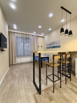 Функциональная планировка: просторная кухня-гостиная 20м2 с зонированием на рабочую зону кухни, обеденную зону и зону отдыха, мастер-спальня с собственной ванной комнатой, вторая спальня с выходом на просторную лоджию, гостевой санузел с душевой кабиной, коридор с большой гардеробной. В мастер-спальне и кухне-гостиной установлены кондиционеры. Хорошо продумана система освещения, что позволяет зонировать пространство.