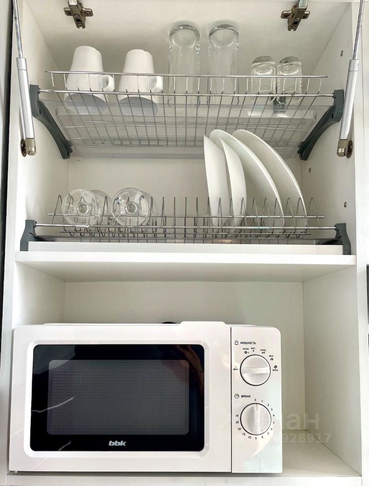 - Кухня с холодильником, плитой, микроволновкой, чайником и посудой