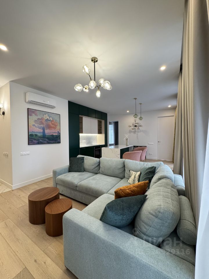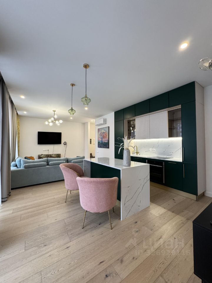 Сдается стильная трехкомнатная квартира в современном монолитном доме 2021 года постройки. Апартаменты расположены на 8 этаже 10-этажного здания. Общая площадь квартиры составляет 75,2 кв. м, а кухня — просторные 35 кв. м. Высокие потолки в 3 метра создают ощущение простора и света. В квартире 10 окон в пол, на 2 стороны и потрясающие виды на закат.