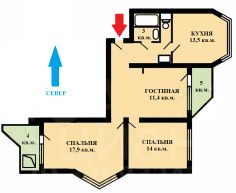 Общая площадь 79 кв.м., без учета лоджий 75,7 кв.м.: гостиная 11,4 кв.м. с застекленной лоджией 5 кв.м., спальня 14 кв.м., спальня 17,9 кв.м. с лоджией 4 кв.м. и эркером, кухня 13,5 кв.м. с эркером. Раздельный санузел в плитке, ванная комната 2,8 кв.м.