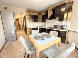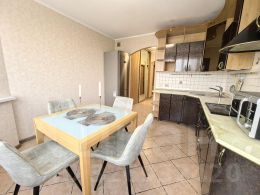 Добротная встроенная кухня, оборудованная техникой: варочная поверхность, вытяжка с подсветкой, электрический духовой шкаф, микроволновка, чайник, 2-хкамерный холодильник. Раскладной стол, 4 стула.
