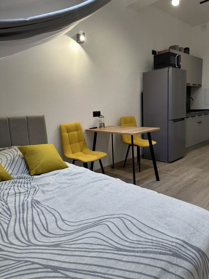 Студия с удобной комфортной для жизни планировкой. Оборудована всем необходимым для комфортной жизни: кондиционер, холодильник с no frost, варочная поверхность, вытяжка, СВЧ, стиральная машина, телевизор со smart TV, фильтры для питьевой воды, набор необходимый посуды, полноразмерная кровать с новым ортопедическим матрасом, большим количеством местных хранения и рабочим столом. Батарея с терморегуляторами. В студии большое количество розеток, проходные выключатели. Всё новое!
