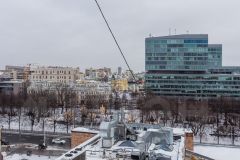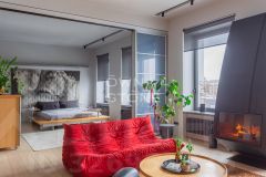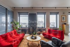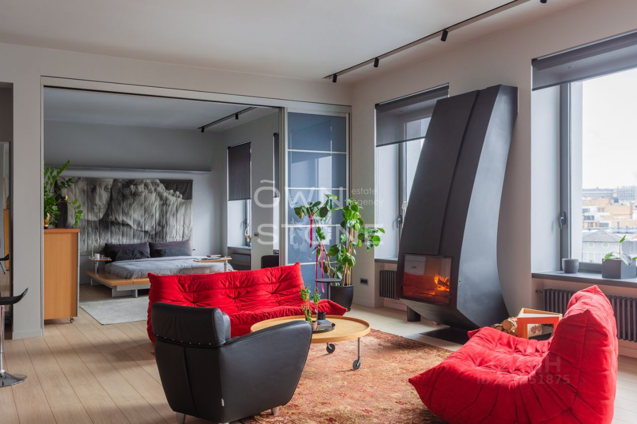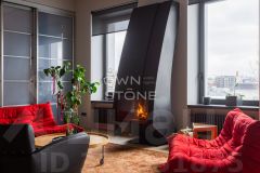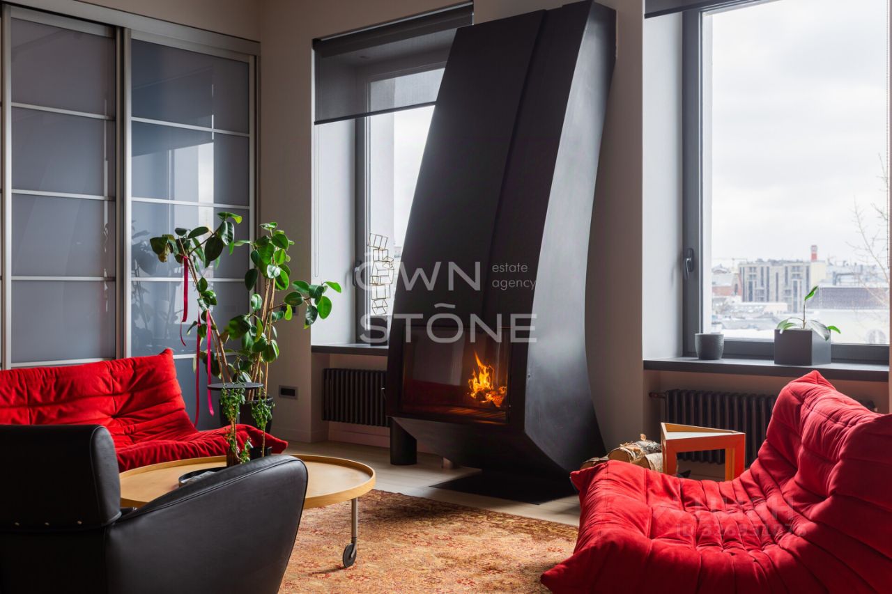 В гостиной — действующий дровяной камин, создающий неповторимую атмосферу уюта. Из окон открывается панорамный вид на Москву.