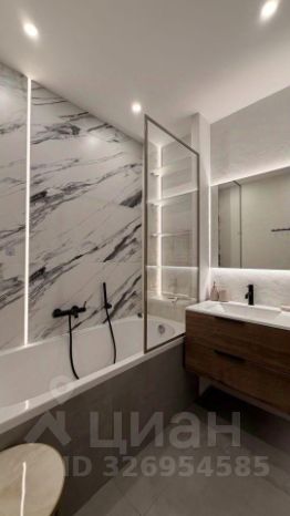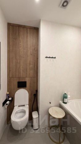 В ванной комнате установлена ванна, что позволит расслабиться после рабочего дня. Санузел выполнен в современном стиле, имеется вместительный встроенный шкаф для косметики и ванных принадлежностей.