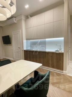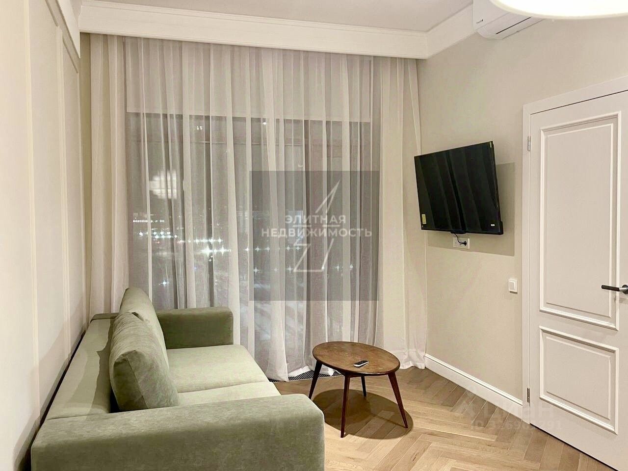 Кухня-гостиная с ТВ с Алисой, раскладывающимся диваном, и журнальным столиком,