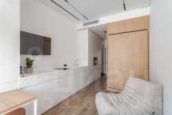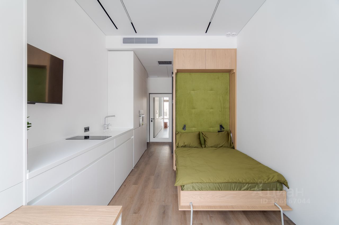 Откидная кровать с ортопедическим матрасом. Эргономичные кресла. Выдвижной стол для работы и еды. Яндекс телевизор со встроенной Алисой. Духовка со встроенной микроволновкой. Стиральная машина. Кондиционер.