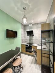 - Холодильник, электрическая плита, стиральная машина, двуспальная кровать, раскладной диван, телевизор и тп. Есть кондиционер и посудомоечная машина;
