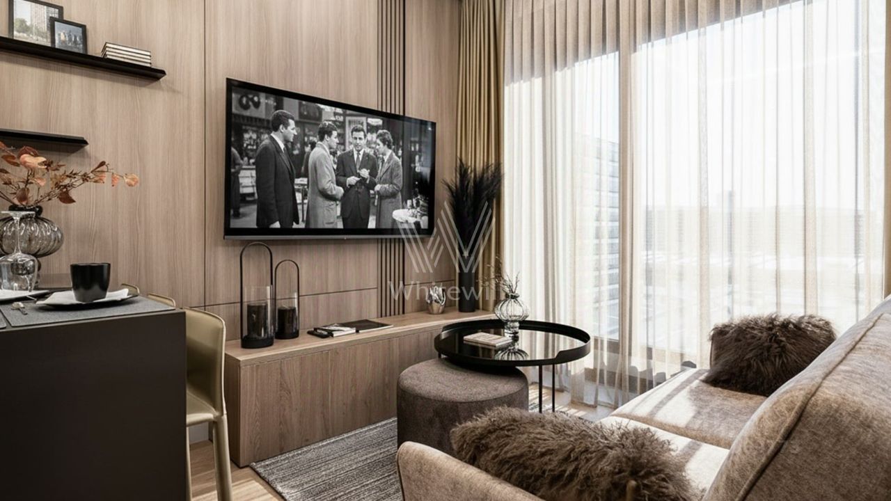 Квартира полностью меблирована и укомплектована бытовой техникой Neff. Кровать с подъёмным механизмом, Смарт-ТВ с голосовым управлением, есть сейф.