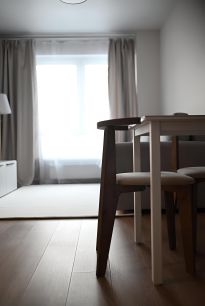 Большая кухня-гостиная, светлая спальная комната, функциональный санузел.