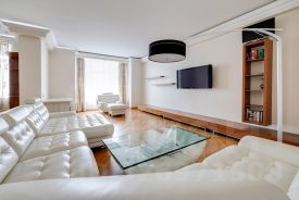 В квартире выполнен ремонт в светлых тонах с элементами классики, использованы натуральные материалы. Имеется необходимая мебель и техника для проживания(стиральная машина, холодильник, духовка и варочная панель, посудомойка, телевизор). Установлена система кондиционирования, теплые полы в с/у, высокие потолки 3м.