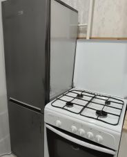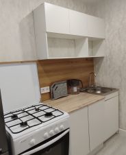 Кухня: модульные шкафы, холодильник, газовая плита, стол, стулья, электрический чайник, необходимая новая посуда в наличии, микроволновая печь - по запросу.