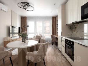 • Кухня-гостиная (студия): Современный гарнитур, встроенная техника премиум (холодильник Weissgauff NoFrost, посудомойка, индукционная панель, духовка с паром, вытяжка, микроволновая печь). Обеденная зона: раздвижной стол и 2 стильных поворотных стула. Мягкая зона: большой диван-кровать Босс Прайм (велюр) с ящиком для хранения. Телевизор Xiaomi 55 (для комфортного просмотра из любой зоны), два кондиционера.