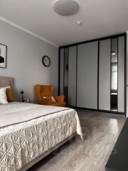 Укомплектована всей необходимой техникой- встроенный холодильник, посудомойка, духовка, варочная панель, свч, стиральная машина, телевизор, кондиционер. Двуспальная кровать с ортопедическим матрасом. Встроенный, вместительный шкаф-купе. Портьеры blackout.