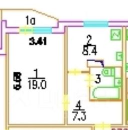 Жилая площадь составляет 19 кв. м, а кухня 8,4 кв. м. Высокие потолки 2.64 метра создают ощущение простора.