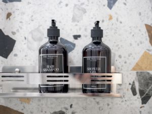 Стильная ванная комната с тропическим душем и набором косметики (гели, шампуни, тапочки, зубные щетки)