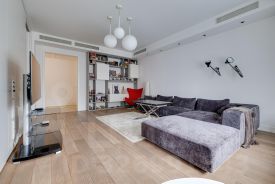 2 спальни: одна с кроватью размером king size и лоджией, вторая с диваном и мини-кабинетом; гостиная c зоной smart TV, кухня-столовая, гардеробная, 2 уборные с ванной и душевой, постирочная, изобилие мест хранения, высокоскоростной Wi-Fi.