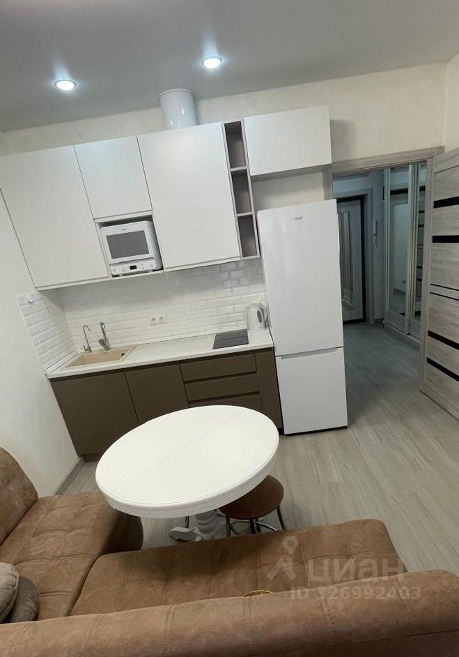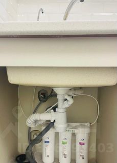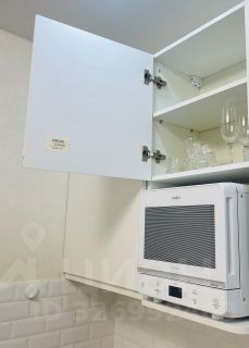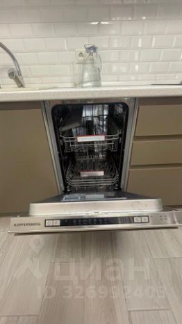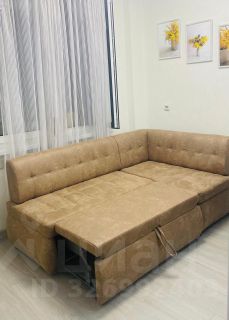 Кухня оснащена варочной панелью, вытяжкой, микроволновой печью, посудомоечной машиной, холодильником, электрическим чайником, системой фильтрации воды Гейзер и раскладывающимся диваном.